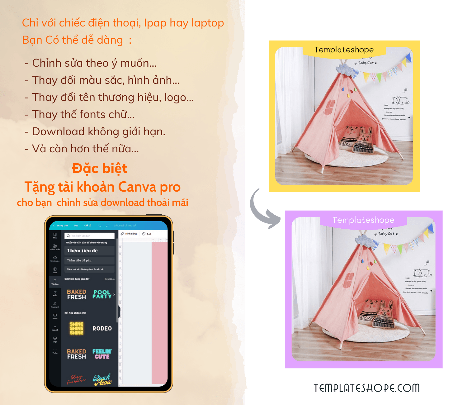 Sau khi hoàn tất thanh toán bạn sẽ nhận được file PDF bộ Shopee templates của bạn, kèm video hướng dẫn nhằm hỗ trợ quá trình thiết kế được dễ dàng và nhanh chóng hơn. Bạn chỉ cần bấm vào link template này sẽ đưa bạn tới Canva để bạn thiết kế. Và sau vài phút chỉnh sửa bạn đã có bộ template tuyệt vời của riêng mình.